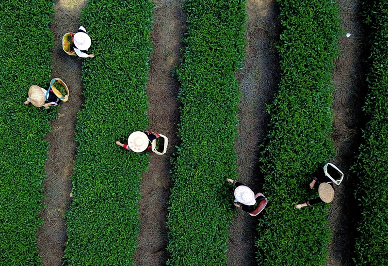 這是瑪坑鄉(xiāng)村民在生態(tài)觀光茶園里采摘綠茶(8月5日無(wú)人機(jī)拍攝)。