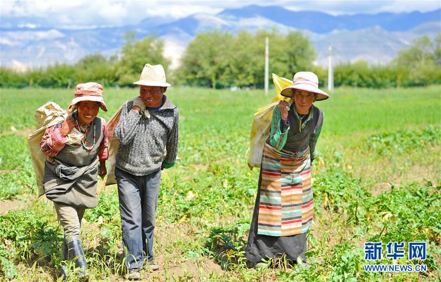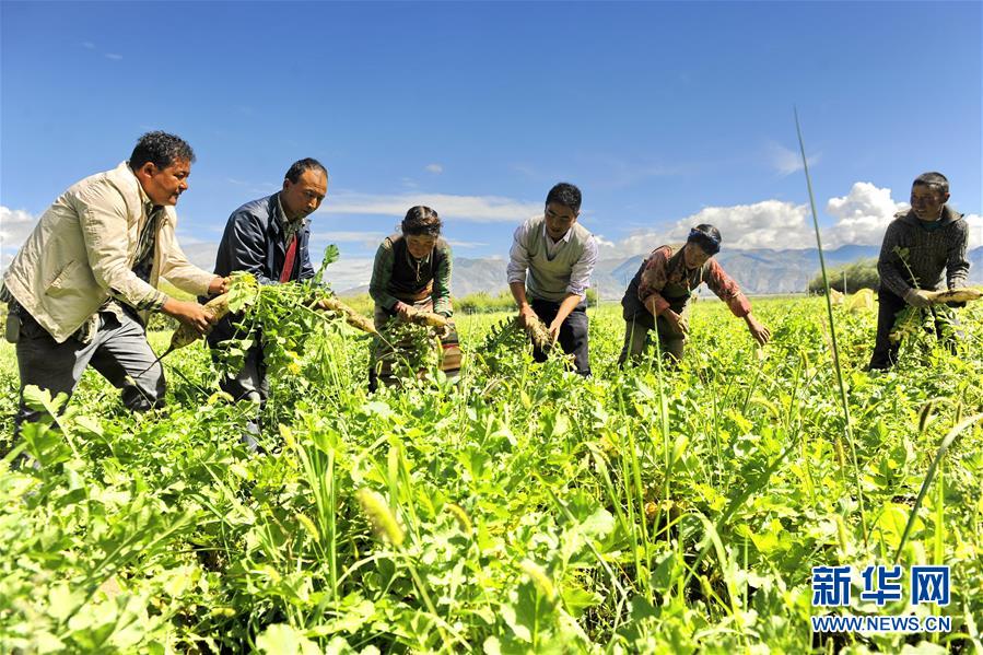 8月8日,在邊雄鄉(xiāng)普夏村蘿卜種植基地,白瑪梅朵合作社工作人員和當(dāng)?shù)厝罕娨黄鹗斋@蘿卜。新華社記者張汝鋒攝
