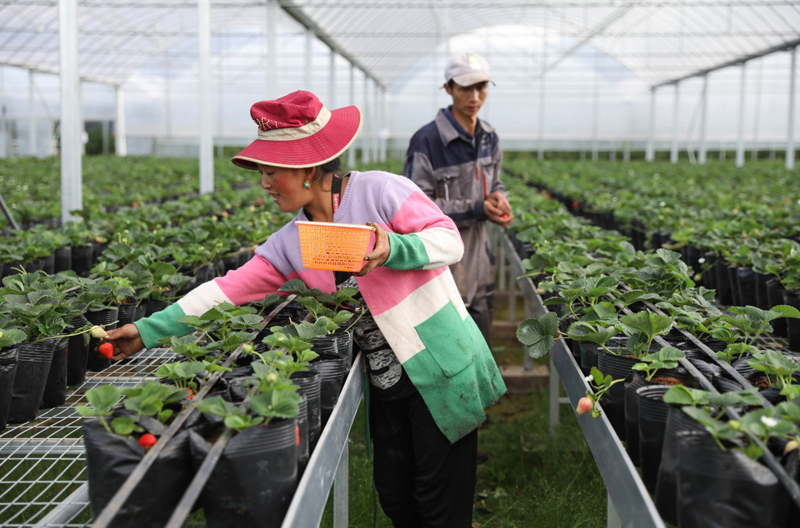 8月11日,在理塘縣濯,F(xiàn)代農(nóng)業(yè)雙創(chuàng)中心,濯桑鄉(xiāng)漢戈村村民格絨卓瑪(前)在蔬菜大棚里采摘草莓。