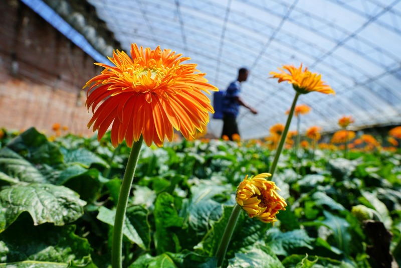 8月16日,河北省灤南縣姚王莊鎮(zhèn)李營村農(nóng)民在大棚內(nèi)管理種植的非洲菊。