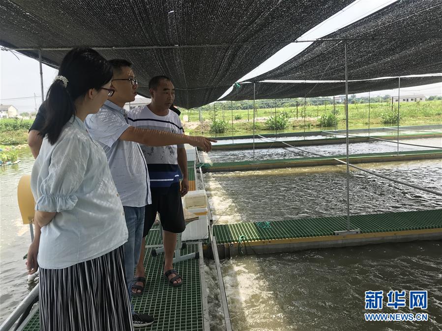 浙江省淡水水產(chǎn)研究所劉梅(左)和原居林(中)在湖州南潯區(qū)菱湖鎮(zhèn)勤勞村指導(dǎo)養(yǎng)殖戶“跑道養(yǎng)魚(yú)”(8月9日攝)。