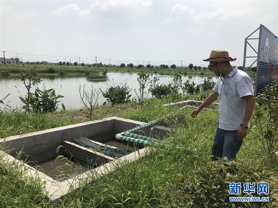 浙江省淡水水產(chǎn)研究所原居林在湖州南潯區(qū)菱湖鎮(zhèn)勤勞村觀察魚(yú)塘排污池(8月9日攝)。