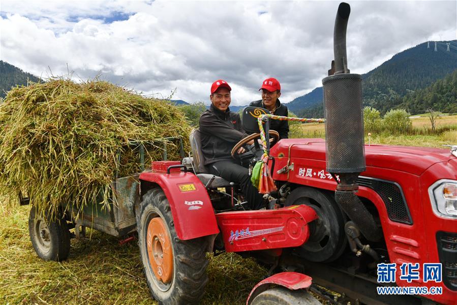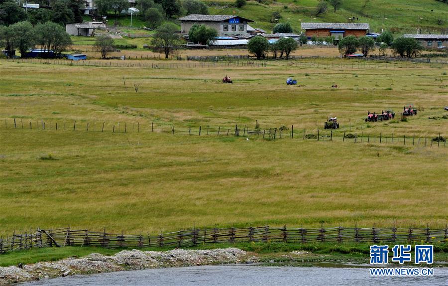 林芝市巴宜區(qū)魯朗鎮(zhèn)農(nóng)牧民在收獲牧草(8月26日攝)。