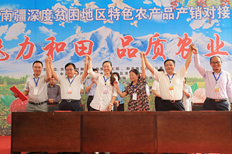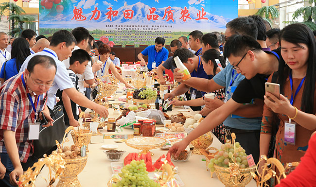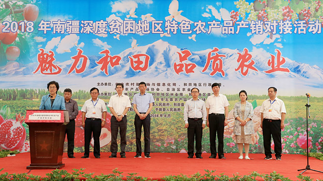 8月28日,2018年南疆深度貧困地區(qū)特色農(nóng)產(chǎn)品產(chǎn)銷對(duì)接活動(dòng)在新疆維吾爾自治區(qū)和田地區(qū)舉辦。14家企業(yè)代表現(xiàn)場(chǎng)簽訂了1.4億元購(gòu)銷協(xié)議,來(lái)自全國(guó)10個(gè)省份58家大型采購(gòu)商全年意向經(jīng)銷全疆農(nóng)產(chǎn)品可達(dá)18.22億元,交易數(shù)量達(dá)21.78萬(wàn)噸。中國(guó)農(nóng)產(chǎn)品市場(chǎng)協(xié)會(huì)會(huì)長(zhǎng)張玉香出席并講話。