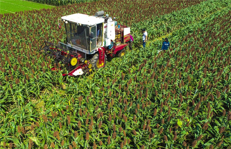 8月27日,在棗強縣肖張鎮(zhèn)西趙莊村,村民使用收割機收割高粱。