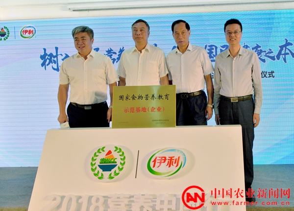 啟動儀式上,陳萌山主任代表國家食物與營養(yǎng)咨詢委員會,為伊利集團頒發(fā)了“國家食物營養(yǎng)教育示范基地”牌匾。右起李棟、陳萌山、陳福泉、孫君茂。中國農(nóng)業(yè)新聞網(wǎng)記者葉曉寧攝