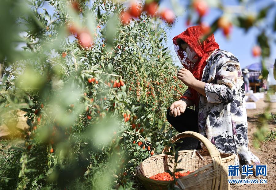 農(nóng)民在寧夏吳忠市同心縣潤(rùn)德莊園枸杞基地采摘枸杞(6月22日攝)。