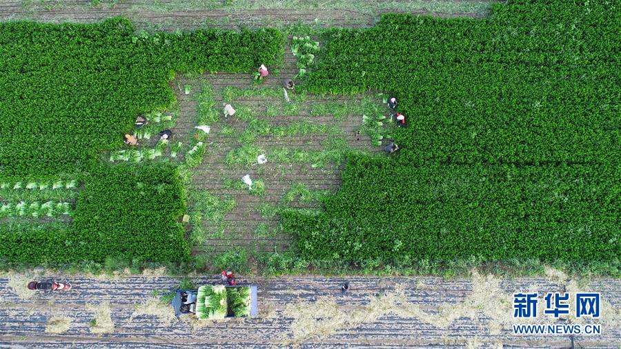 農(nóng)民在寧夏固原市西吉縣興隆鎮(zhèn)收割芹菜(8月9日無(wú)人機(jī)航拍)。
