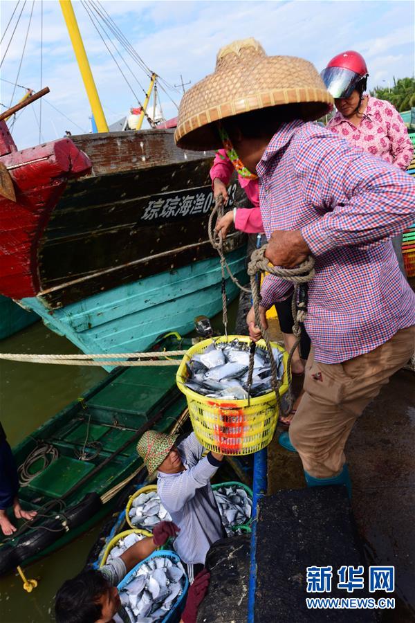 9月2日,漁民在海南省瓊海市潭門港碼頭裝卸海魚。