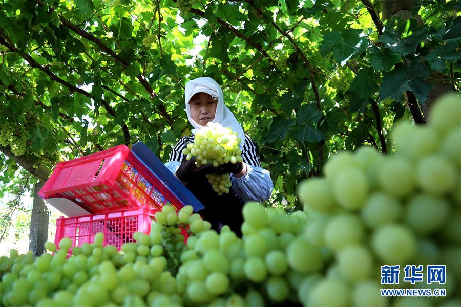 當(dāng)日,甘肅省敦煌市陽關(guān)鎮(zhèn)2萬畝優(yōu)質(zhì)葡萄正式上市。據(jù)了解,目前敦煌市栽植葡萄15萬畝,以葡萄為主的優(yōu)質(zhì)林果產(chǎn)業(yè)已成為帶動(dòng)當(dāng)?shù)剞r(nóng)民致富、農(nóng)業(yè)增效、農(nóng)村發(fā)展的支柱產(chǎn)業(yè)。新華社發(fā)(張曉亮 攝)