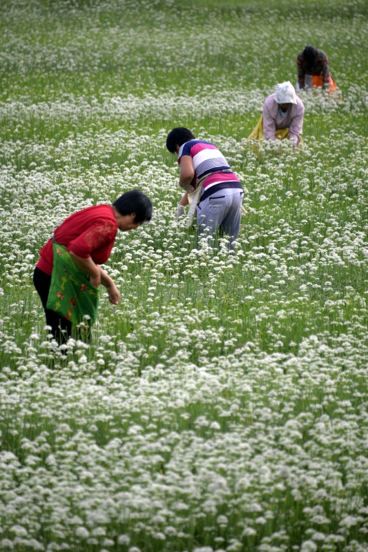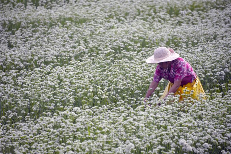 9月5日,在山東省聊城市茌平縣賈寨鎮(zhèn)韭菜地里,村民在采摘韭花。