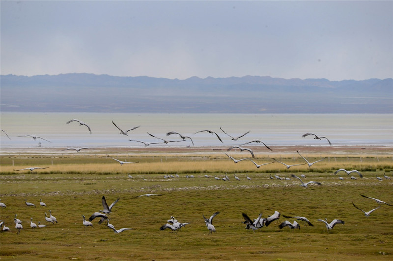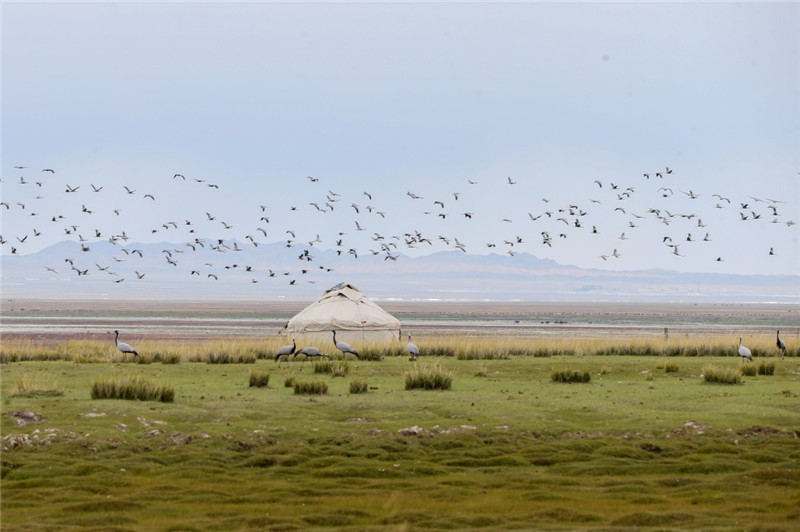 9月11日在新疆哈密巴里坤哈薩克自治縣草原上拍攝的蓑羽鶴。