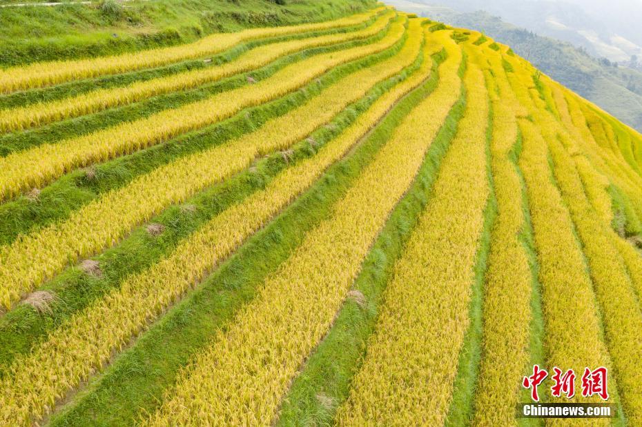 9月11日,航拍貴州省榕江縣陽(yáng)開梯田秋色,農(nóng)民在田間勞作。金秋時(shí)節(jié),貴州省榕江縣計(jì)劃鄉(xiāng)陽(yáng)開梯田水稻進(jìn)入成熟期,金黃色的梯田構(gòu)成了一幅美麗的秋天圖景。