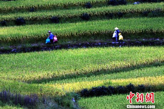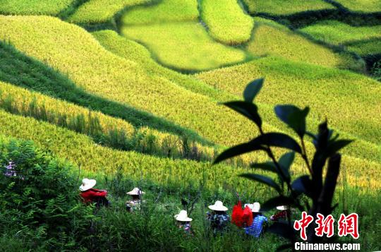 9月12日,福建省連城縣羅坊鄉(xiāng)坪上村金秋梯田引城里來的游人在觀景臺合影,在稻浪中拍照。坪上村,被游人譽為“梯田上的村莊”。當(dāng)日,坪上村盡管天空無云,陣陣秋風(fēng)把那似秤鉤一樣的金黃稻穗吹得沙沙作響,千余畝梯田翻滾著金色的波浪,一派豐收在望景象,引來一拔又一拔攝影愛好者與休閑游人。