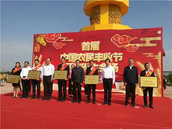 圖為9月23日,在河南省新鄭市紅棗小鎮(zhèn)舉行的河南首屆“中國(guó)農(nóng)民豐收節(jié)”主會(huì)場(chǎng)上,省市領(lǐng)導(dǎo)為河南省2018年新型職業(yè)農(nóng)民創(chuàng)業(yè)創(chuàng)新大賽獲獎(jiǎng)選手頒獎(jiǎng)。