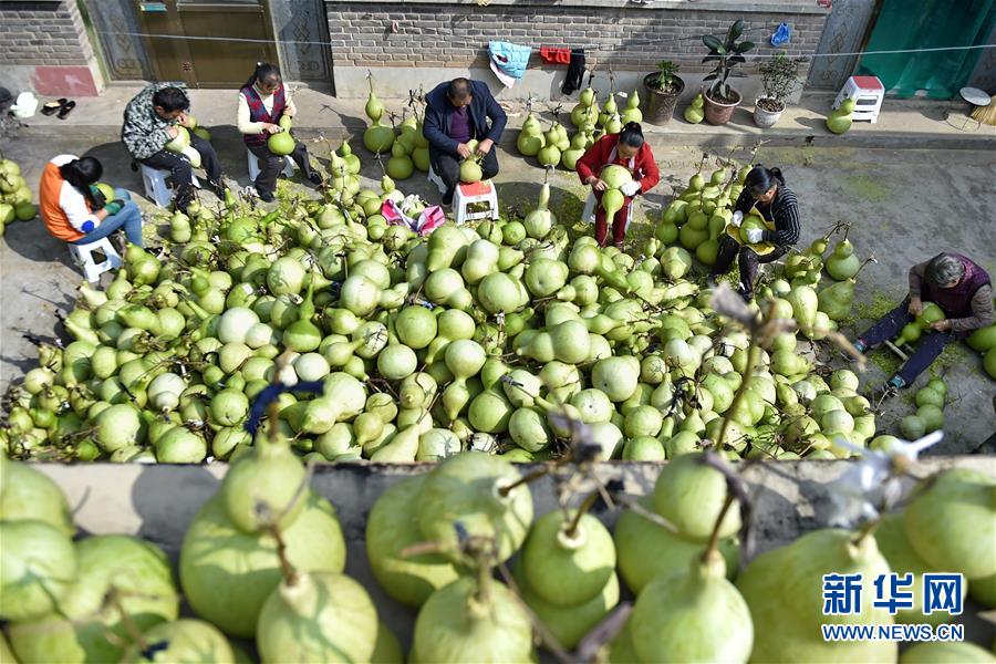 近日,山西省安澤縣和川鎮(zhèn)孔旺村種植的葫蘆喜獲豐收,村民們忙著將摘下的葫蘆去皮晾干?淄逵2016年成立葫蘆種植合作社,種植、采摘、加工等環(huán)節(jié)全部由貧困戶負(fù)責(zé),為貧困戶拓寬增收渠道。新華社記者 曹陽(yáng) 攝
