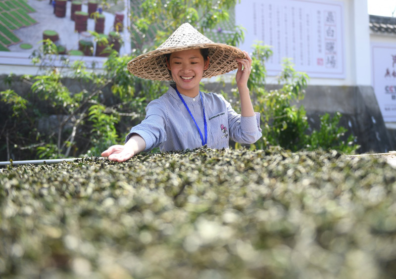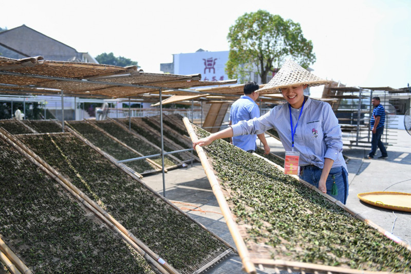 10月9日,參賽選手將茶葉上架曬制。