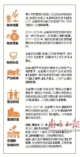 在構(gòu)建大扶貧工作格局方面,我省全社會共同參與的組織動員體系基本建立。其中,珠三角和粵東粵西粵北對口幫扶不斷優(yōu)化,建立了市縣鎮(zhèn)對口幫扶協(xié)調(diào)聯(lián)動機制,珠三角6市向被幫扶的粵東粵西粵北12個市派出駐市駐縣工作隊52個,駐村工作隊1719個,幫扶相對貧困戶11.82萬戶36.78萬人,投入幫扶資金93.53億元,發(fā)展產(chǎn)業(yè)幫扶項目34.7萬個,幫扶就業(yè)19.5萬人。