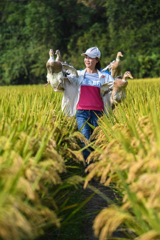 10月17日,種植基地負(fù)責(zé)人陳梅芳抓住幾只稻田放養(yǎng)的鴨子。