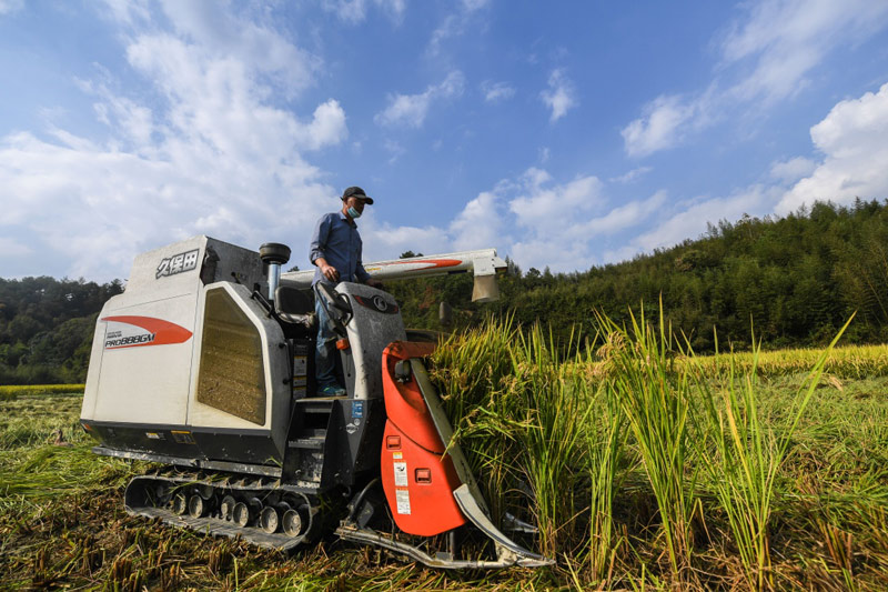 近日,浙江省杭州市臨安區(qū)的省級(jí)標(biāo)準(zhǔn)化糧食生產(chǎn)基地——太陽(yáng)鎮(zhèn)太陽(yáng)米種植基地內(nèi),500多畝生態(tài)水稻收割正式拉開序幕。據(jù)該基地負(fù)責(zé)人介紹,得益于天氣條件等因素,今年水稻長(zhǎng)勢(shì)較往年要好,預(yù)計(jì)每畝的稻米產(chǎn)量為675公斤,同時(shí)因?yàn)椴捎蒙鷳B(tài)種養(yǎng)結(jié)合的方式,在水稻田中還套養(yǎng)了甲魚、牛蛙、鴨子等,經(jīng)濟(jì)效益十分明顯。新華社記者 徐昱 攝