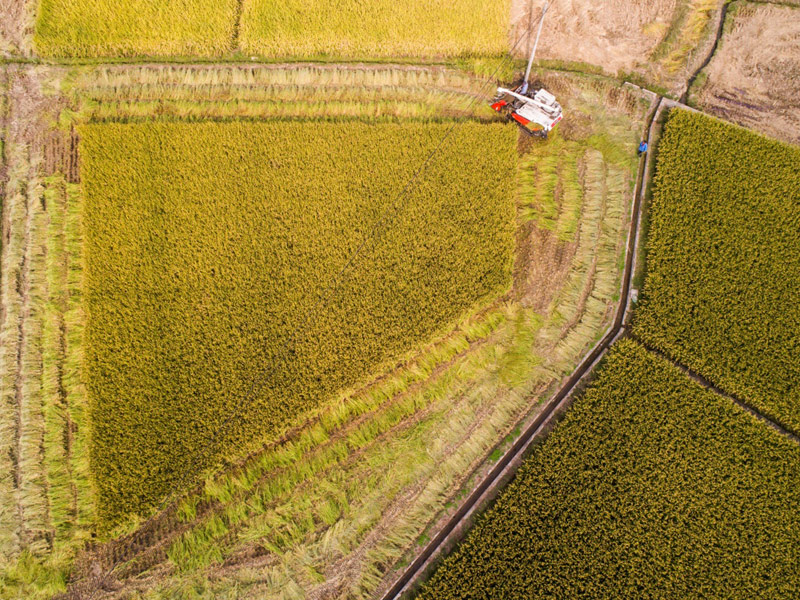 10月17日,工作人員操作收割機(jī)收割水稻(無(wú)人機(jī)拍攝)。