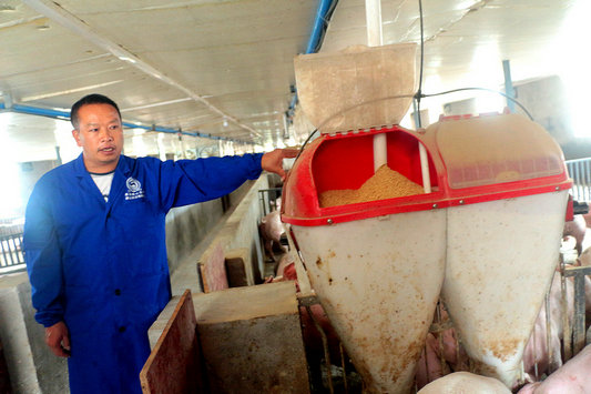“同樣是養(yǎng)殖2000頭豬,給豬喂料別的養(yǎng)殖場至少需要8個人、耗時達1個多小時完成,而我養(yǎng)豬用上全自動喂料機后,送料、喂料、喂水都是由機器來完成,偌大一個養(yǎng)豬場僅需3個人就足夠了,省時省力還省料,真是一舉多得。”10月21日,筆者走進四川省瀘州市納溪區(qū)龍車鎮(zhèn)金龍村村民王小斌的養(yǎng)豬場,他高興地告訴筆者說。