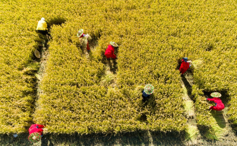 10月27日,江蘇海安鄉(xiāng)村旅游節(jié)上拍攝的人工割稻演示(無人機拍攝)。新華社發(fā)(顧華夏 攝)