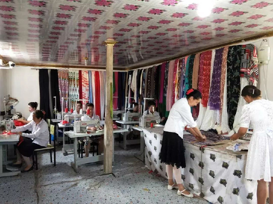 村民左日古·阿不都熱依木的丈夫年初被檢查出胃癌,家里還有3個孩子要上學,生活非常困難。工作隊了解這一情況后,利用她家現(xiàn)有的空房,幫助成立了“家庭扶貧車間”,免費配備了10臺縫紉機,由合作社為她提供訂單及材料,F(xiàn)在的左日古·阿不都熱依木月每個月都能掙到2500元以上的工資,生活得到了很大改善,還帶動了村里另外5名貧困婦女就業(yè),成為村里的巾幗致富帶頭人。