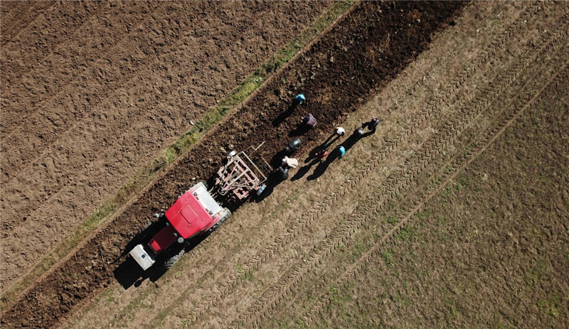 11月1日,在甘肅省定西市渭源縣蓮峰鎮(zhèn)何家灣村,藥農(nóng)進(jìn)行機(jī)械化采藥作業(yè)(無人機(jī)拍攝)。