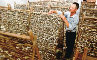 陳世錦給記者算到,種桑養(yǎng)蠶投資小、周期短、見效快。桑樹的壽命一般是20年,一年可以采摘五六次,能夠喂養(yǎng)18~22批蠶。一般一畝桑樹可養(yǎng)一張蠶,農(nóng)戶只要種5畝桑樹,分批采收,就可保障每月都有桑葉收割,半個(gè)月就可出一批蠶。按照目前一斤蠶繭平均22元的收購價(jià),農(nóng)民一家養(yǎng)一張蠶,一個(gè)月最少都有3500元的收入!斑@就像每半個(gè)月就能領(lǐng)一次工資!