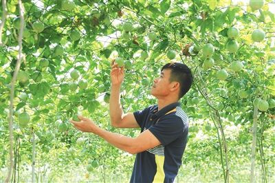 170畝的果園內,百香果茁壯生長!叭~子不能太密,否則果實個頭小,難賣出好價錢!蓖跤室贿呅拗羧~,一邊向來訪的農戶介紹。