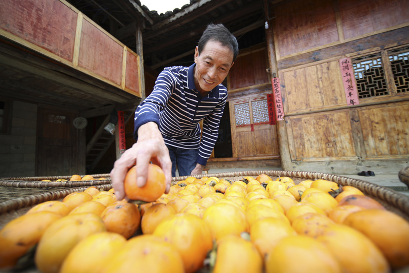 在貴州省玉屏侗族自治縣朱家場(chǎng)鎮(zhèn)魚塘村,農(nóng)民在晾曬柿子(10月3日攝)。