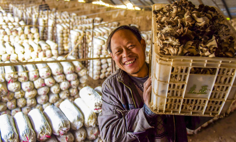 11月18日,在衡水市冀州區(qū)周村鎮(zhèn)東高村食用菌種植基地的大棚里,村民在搬運(yùn)蘑菇。