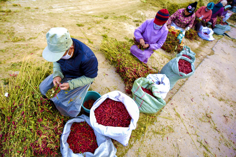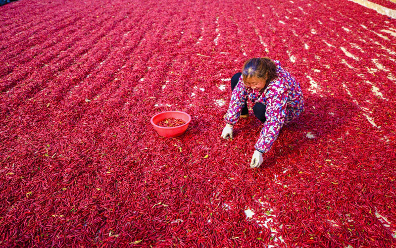 11月18日,在衡水市冀州區(qū)周村鎮(zhèn)辣椒加工交易基地,椒農(nóng)在對(duì)摘好的辣椒進(jìn)行二次篩選。