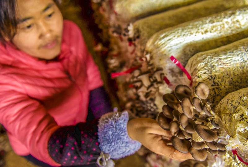 11月18日,在衡水市冀州區(qū)周村鎮(zhèn)東高村食用菌種植基地的大棚里,村民在采摘蘑菇。