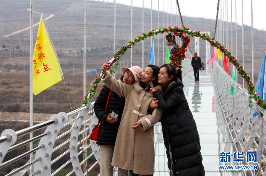 11月20日,在澠池縣洪陽(yáng)鎮(zhèn)柳莊村,幾名女孩在觀光玻璃棧道上自拍。新華社記者謝秀棟攝