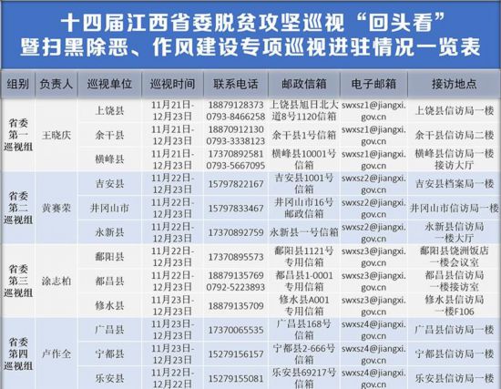 根據(jù)安排,本輪江西省委巡視時間為1個月。省委各巡視組設(shè)專門聯(lián)系電話、郵政信箱、電子郵箱、舉報信箱等,受理被巡視地方脫貧攻堅、掃黑除惡、作風(fēng)建設(shè)方面的舉報和反映。其他不屬于本次專項巡視受理范圍的信訪問題,省委巡視組不作了解印證,只按規(guī)定交由被巡視地方或有關(guān)部門處理。