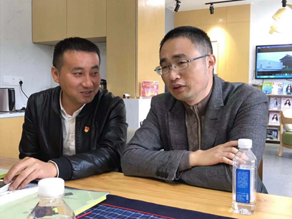 圖為:廊下鎮(zhèn)鎮(zhèn)山塘村黨總支書記楊立平(右)與廣陳鎮(zhèn)山塘村黨總支書記金建東(左)探討主題黨日活動(dòng)策劃