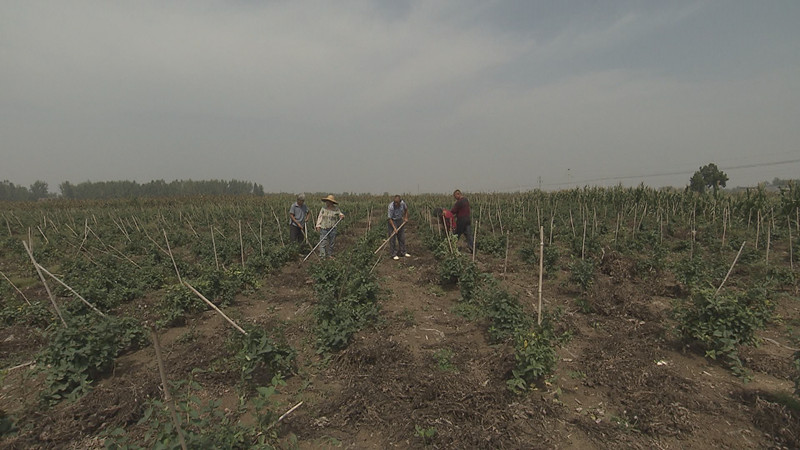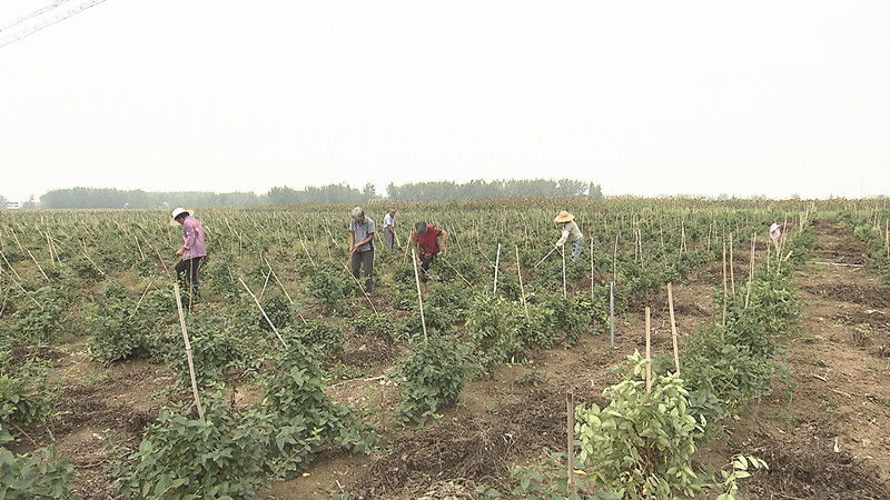 在蒙城縣小辛集鄉(xiāng)段廟村的幾百畝金銀花種植基地里,村里的村民們正在忙著給金銀花除草、打岔。貧困戶黃素芳家里今年種植了6畝金銀花,在忙完自己地里的活以后,她還可以在村里的合作社地里干些雜活,她高興的說:“今年種了金銀花,一畝地補助一千塊錢,補助十年的,金銀花地里面套種的花生,每年又收到一千塊錢,給家里帶來了穩(wěn)定的收入!