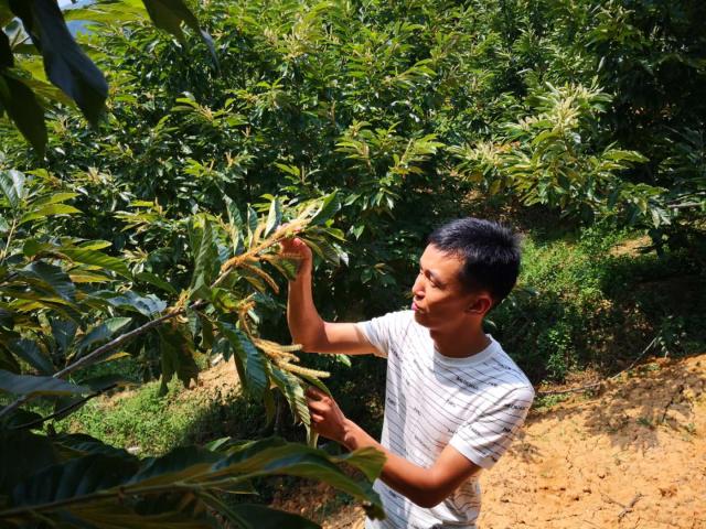 洛郎村村民黃巢在板栗園查看板栗樹生長情況。