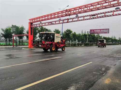 在上蔡縣環(huán)城路,收割機從升高后的限高桿下順利通過。
