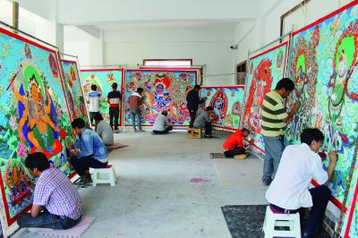 與此同時(shí),當(dāng)?shù)卣ㄟ^非遺助推精準(zhǔn)扶貧,不斷探索文化致富路子。傳習(xí)基地、綜合傳習(xí)中心和民間藝人在招收徒弟時(shí),首先考慮困難家庭、殘疾家庭等貧困戶的子女;唐卡、堆繡、泥塑、石刻產(chǎn)品銷售已成為同仁縣吾屯、年都乎、加查瑪、郭麻日、尕薩日村群眾家庭收入的主要來源。經(jīng)統(tǒng)計(jì),同仁縣吾屯村從事熱貢藝術(shù)的戶數(shù)占全村總戶數(shù)的98%,人均收入從5年前的5000余元增長到目前的3萬余元。年都乎村從事熱貢藝術(shù)的戶數(shù)占全村總戶數(shù)的70%以上,人均收入從5年前的3000余元增長到1.5萬元。在吾屯和年都乎村,隨手推開一家農(nóng)戶門,即可看到“家家作畫、人人從藝”的繁榮景象,這里已經(jīng)發(fā)展成為聞名全省的文化致富先進(jìn)村。