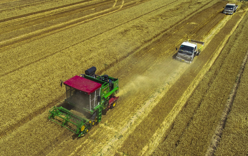“三夏”時(shí)節(jié),華北平原麥田滿目金黃,麥?zhǔn)展ぷ鬟M(jìn)入高峰期。多地農(nóng)民抓住天氣晴好的有利時(shí)機(jī)搶收小麥,田野里呈現(xiàn)出一派繁忙景象。新華社記者 李曉果 攝