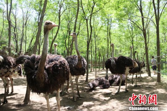 夏日午后,在甘肅慶陽(yáng)市西峰區(qū)顯勝鄉(xiāng)毛寺村口,沿著狹窄的小路盤山而上,曲徑通幽處,一大片蔥郁的樹林躍入眼簾。林間,一群體型巨大的鴕鳥有的揚(yáng)起長(zhǎng)脖子?xùn)|張西望,優(yōu)哉游哉撒歡奔跑。