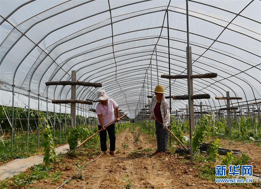 6月13日,在合陽(yáng)縣豐阜現(xiàn)代農(nóng)業(yè)園區(qū),農(nóng)民在葡萄大棚內(nèi)除雜草。