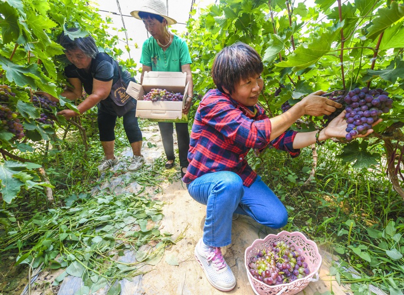 6月19日,在衡水市桃城區(qū)鄧莊鎮(zhèn)一家農(nóng)場(chǎng),果農(nóng)忙著采摘葡萄。