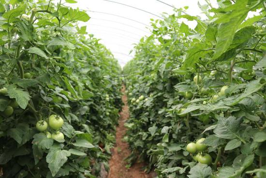 盛夏季節(jié),艷陽高照,樹木植被都被曬得沒精打采。但在張軍廷的西紅柿大棚里,滿眼郁郁蔥蔥,綠葉舒展,果實累累,長勢喜人。