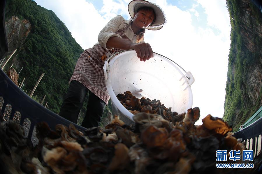 6月21日,在貴州省畢節(jié)市赫章縣雙坪鄉(xiāng)新田村黑木耳種植基地,村民將采摘的木耳倒進(jìn)筐里。