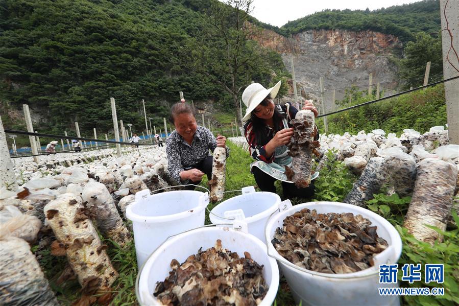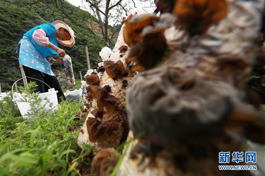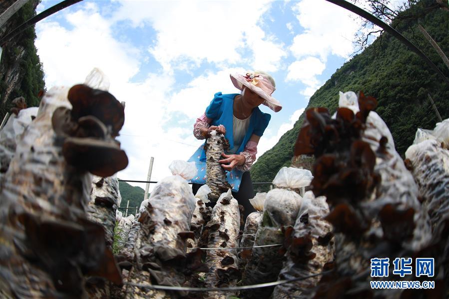 6月21日,村民在貴州省畢節(jié)市赫章縣雙坪鄉(xiāng)新田村黑木耳種植基地采摘木耳。