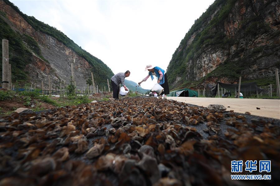 6月21日,在貴州省畢節(jié)市赫章縣雙坪鄉(xiāng)新田村黑木耳種植基地,村民在涼曬木耳。